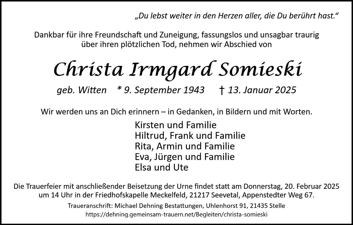 Ich wünsche Ihnen für den Abschied, am 20.2. 2025 um 14 Uhr, einen getrösteter und liebevollen Gang zur letzten Ruhestätte, in Meckelfeld.