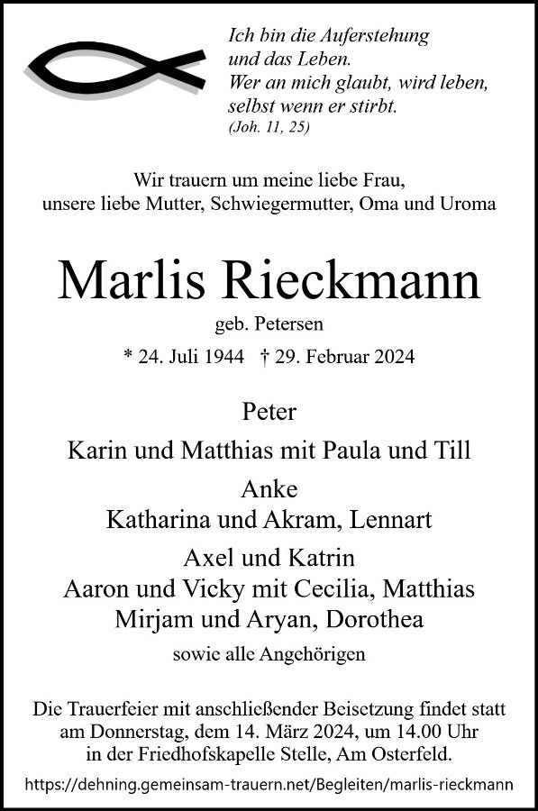 Unter dem Schutz und Schirm des Höchsten mögt Ihr Trost und Kraft finden, zum Leben ohne sie.