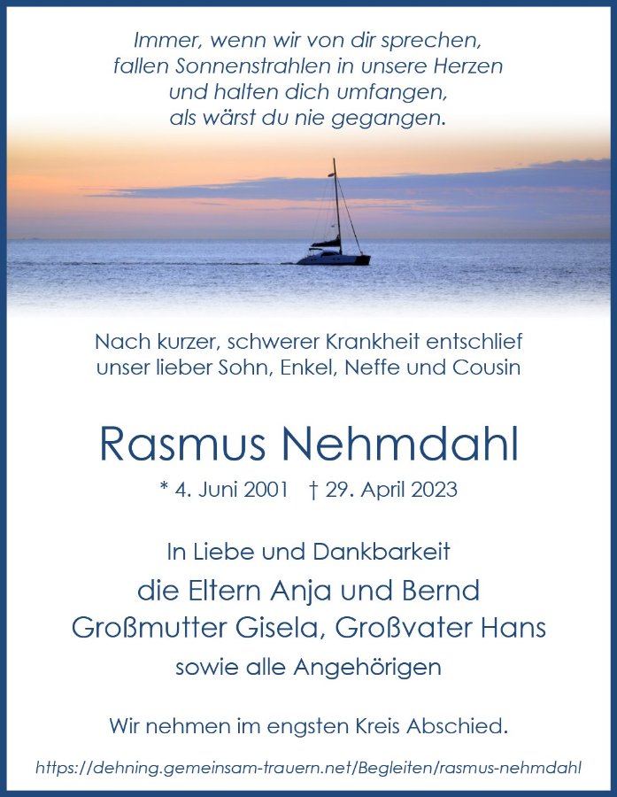 ich sende Ihnen mein herzliches Beileid zum Tode Ihres Sohnes Rasmus.